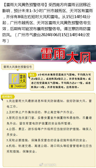 受西南边向雷雨云团移近影响,预测改日1-3小时广州市越秀区、河汉区有雷雨,并伴有8级阁下短时大风和雷电。从15日14时41分起,广州市越秀区、河汉区雷雨大风黄色预警信号收效,后期有可能发布暴雨预警信号。请驻扎防雨防雷防风。
