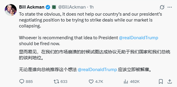 这位亿万大亨投资者命令特朗普实施90天的暂停期,以便通过谈判责罚关税公约。Ackman合计,在阛阓崩溃时试图完了公约无助于谈判,并默示向特朗普保举这一决策的东说念主应该立即被奉命。